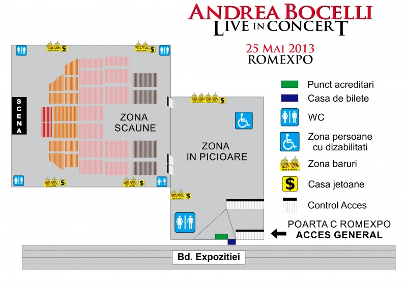 Biletele pentru concertul Andrea Bocelli de la Bucureşti pot fi achiziţionate în reţeaua Eventim şi online pe www.eventim.ro la următoarele preţuri: