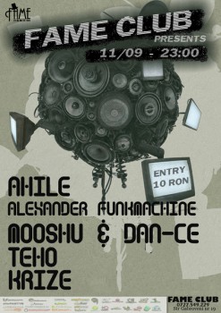 Sâmbătă, 11 septembrie 2010, ora 23:00, Ahile, Alexander Funkmachine, Dan-Ce & Mooshu, Teho & Krize vor mixa în Club Fame din Bucureşti.