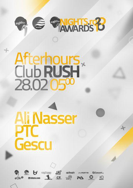 Duminică, 28 februarie 2010, ora 5:00, Ali Nasser, PTC & Gescu vor mixa la Nights.ro awards afterhours party în Rush Club din Bucureşti.