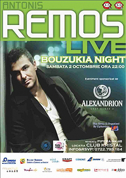 Sâmbătă, 2 octombrie 2010, ora 22:00, Antonis Remos va concerta în Kristal Glam Club din Bucureşti.