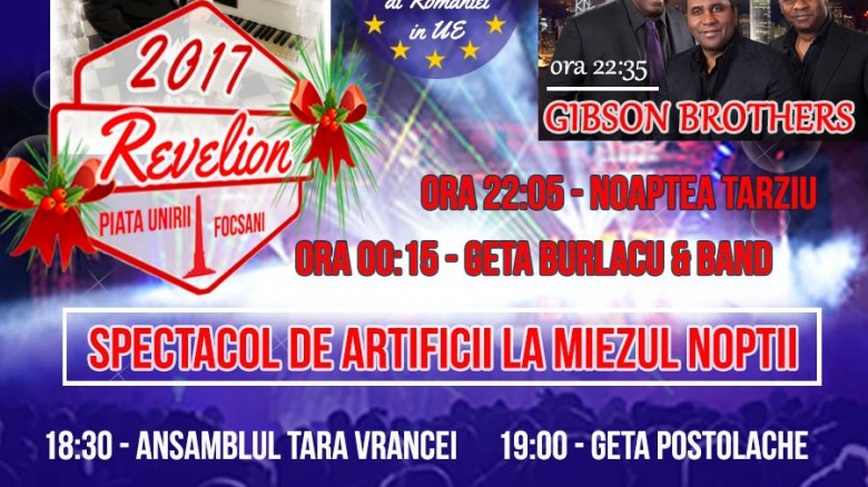 Sâmbătă, 31 decembrie 2016, de la ora 18:30, Primăria Municipiului Focşani organizează Revelionul 2017, în Piața Unirii din Focşani. Focuri de artificii, jocuri lasere, hit-uri celebre şi multă, multă voie bună. Intrarea este liberă!
