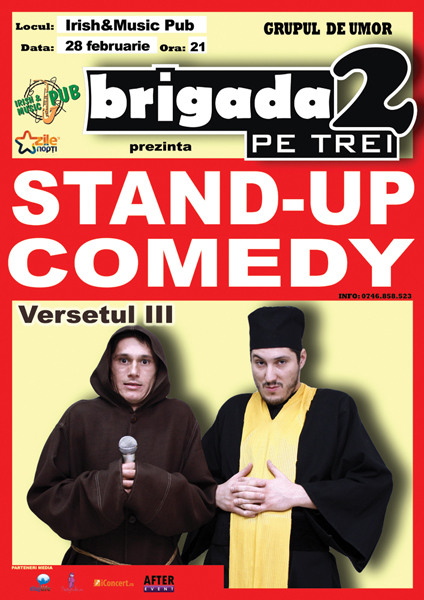 Duminică, 28 februarie 2010, ora 21:00, în Irish & Music Pub din Cluj-Napoca are loc show-ul de stand-up comedy cu „Brigada 2 pe trei„.