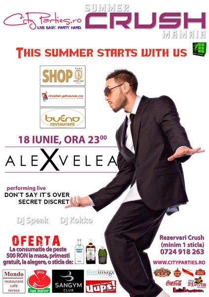 Vineri, 18 iunie 2010, ora 23:00, Alex va concerta în Club Summer Crush din Mamaia.