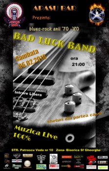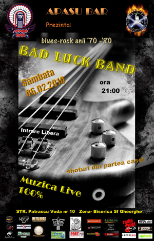 Sâmbătă, 6 februarie 2010, ora 21:00, trupa Bad Luck Band ne invită la un concert de cover-uri la Apasu Bar din Bucureşti.