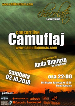 Sâmbătă, 2 octombrie 2010, ora 22:00, trupa Camuflaj alături de Anda Dimitriu vor concerta la Chocolate Society Club din Buzău.