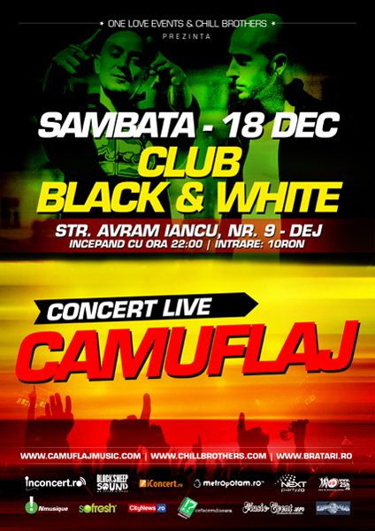 Sâmbătă, 18 decembrie 2010, ora 22:00, trupa Camuflaj va concerta la Club Black & White din Dej.