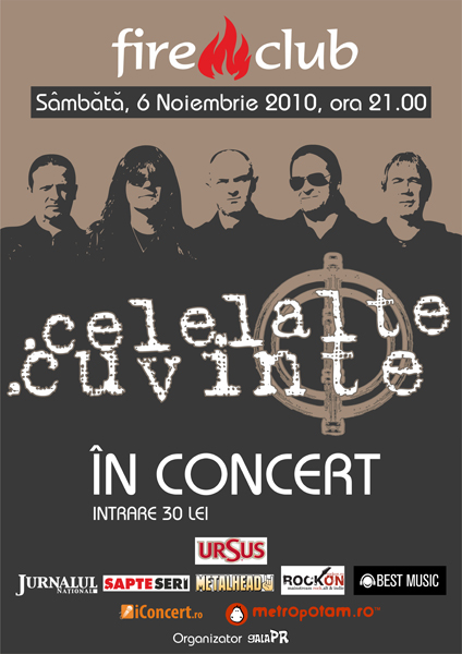Sâmbătă, 6 noiembrie 2010, ora 21:00, trupa Celelalte Cuvinte va concerta în Fire Club din Bucureşti.