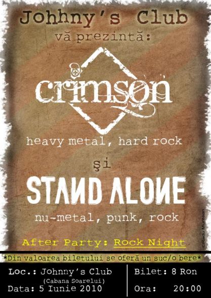 Sâmbătă, 5 iunie 2010, ora 20:00, trupele Crimson şi Stand Alone vor concerta la Johnny’s Club din Satu Mare.