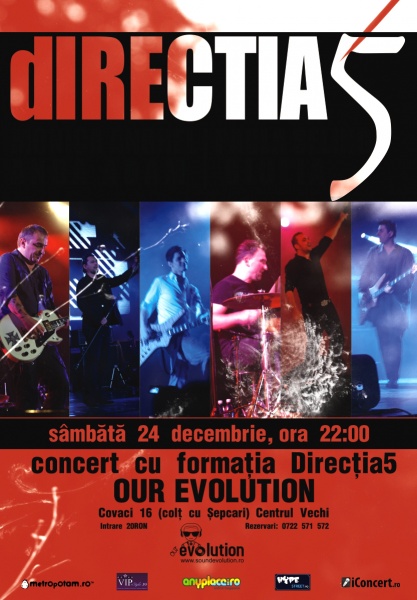 Sâmbătă, 24 decembrie 2011, de la ora 22:00, în Our Evolution din Bucureşti vor concerta cei de la dIRECŢIA 5.
