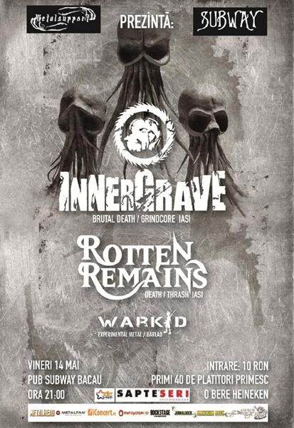 Vineri, 14 mai 2010, ora 21:00, trupele Innergrave, Rotten Remains şi Warkid vor concerta la Pub Subway din Bacău.