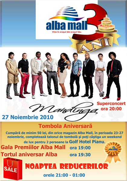 Sâmbătă, 27 noiembrie 2010, ora 20:00, trupa Mandinga va concerta la Alba Mall din Alba Iulia.