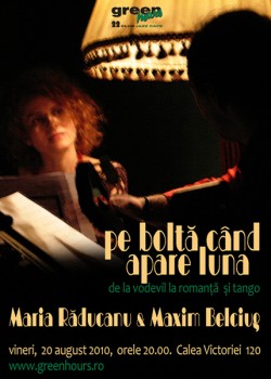 Vineri, 20 august 2010, ora 20:00, Maria Răducanu şi Maxim Belciug vor concerta la Green Hours din Bucureşti în cadrul concertului „Pe boltă când apare luna„.