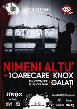 Vineri, 15 octombrie 2010, ora 20:00, Nimeni Altu’, Knox şi 1Oarecare vor concerta la Scena Cafe din Galaţi.