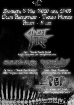 Sâmbătă, 8 mai 2010, ora 19:00, trupa Open Fire va concerta în Club BackStage din Târgu Mureş.