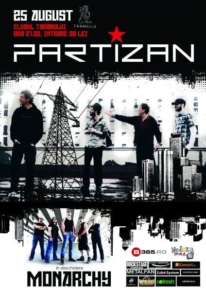 Joi, 25 august 2011, de la ora 21:00, Clubul Ţăranului Român din Bucureşti vă invită la un concert aniversar Partizan. În deschidere vor concerta Monarchy.