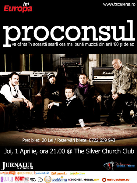 Joi, 1 aprilie 2010, ora 21:00, Proconsul vaconcerta în clubul The Silver Church din Bucureşti.