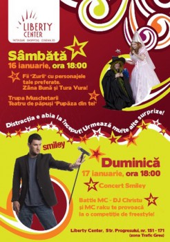 Sambata si duminica, 16 si 17 ianuarie 2010, ora 18:00, Liberty Center Mall din Bucuresti ne-a pregatit o seara cu teatru pentru cei mici si un concert Smiley.