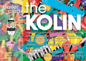 După succesul pe care l-au avut concertând prima dată la Cluj în decembrie 2009, The Kolin revin în forţă cu piese noi de pe următorul album: „Ariel”. The Kolin s-au format în 2007 în Budapesta iar sound-ul acestora variază de la indie la old-school disco şi new rave. Ceea ce atrage şi uimeşte este imaginea scenică plină de culoare şi presărată cu mult kitsch intenţionat, rezultatul fiind o reacţie foarte pozitivă din partea publicului. Primul lor produs discografic „Yell into the Kazoo” a fost scos sub egida Universal Hungary în 2008 . Fiind premiaţi de două ori consecutiv pentru BEST HUNGARIAN ACT în cadrul MTV EUROPEAN MUSIC AWARDS 2009&2010, renumele acestora vorbeşte de la sine. În prezent formaţia lucrează la ultimele pregătiri pentru următorul titlu discografic care e gata înregistrat : „ARIEL”. Fiind un concept album ce reciclează, sub o altă formă, eroii unor poveşti clasice precum cea a lui Pinocchio sau Mary Poppins, „ARIEL” va reprezenta noua piesă de rezistentă pentru un 2011 ce promite a fi electro! De curând au terminat filmările pentru cel de-al treilea clip :”Mountain King”, fiind primul clip stereografic 3D din istoria muzicală maghiară. Publicul din Boiler Club va avea parte de un preview substanţial din noul album.
