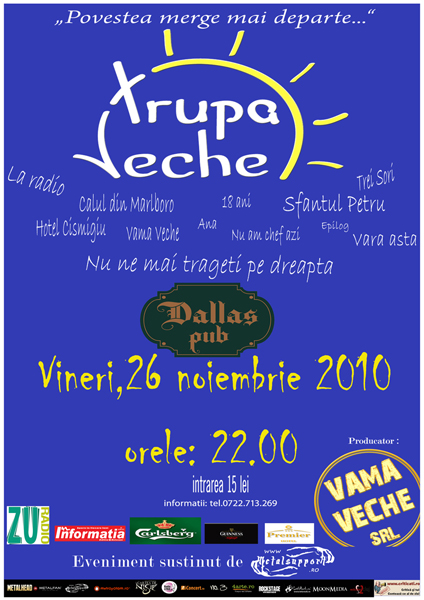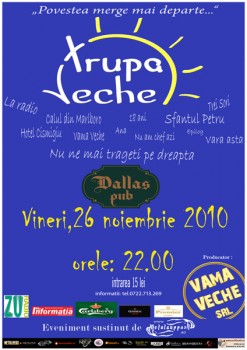 Vineri, 26 noiembrie 2010, ora 22:00, Trupa Veche va concerta la Pub Dallas din Botoşani.