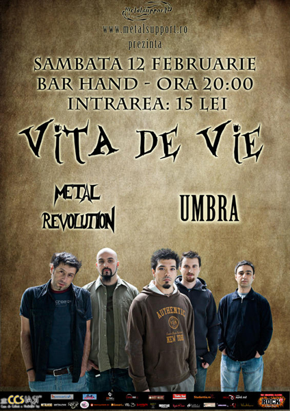 Sâmbătă, 12 februarie 2011, ora 20:00, la Club Hand din Iaşi vor concerta trupele Viţa de Vie, Metal Revolution & Umbra.