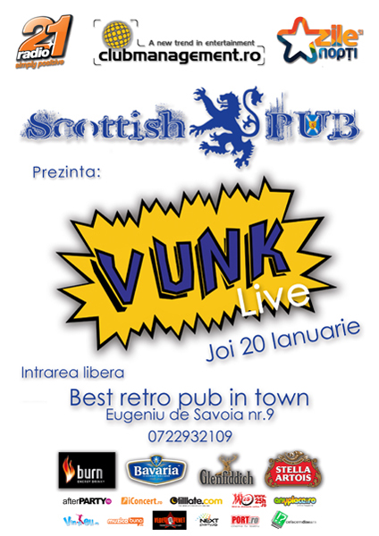Joi, 20 ianuarie 2011, trupa Vunk va concerta la Scottish Pub din Timişoara.