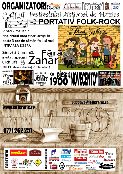 Vineri, 7 mai, are loc Gala Festivalului Naţional de Muzică „Portativ folk-rock”, intrarea este liberă.