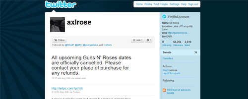 Potivit www.billbord.com Axl Rose nu şi-a mai utilizat de câteva luni contul. Iar atunci când făcea acest lucru îşi actualiza profilul prin intermediul iPhone-ului, în timp ce ultimul mesaj este postat via mobile web.