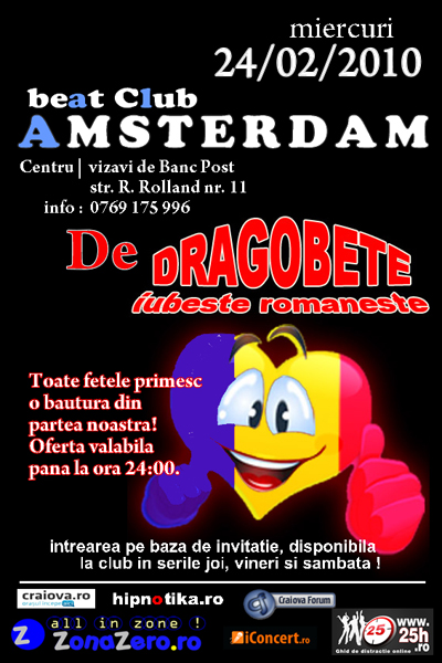 Miercuri, 24 februarei 2010, Amsterdam beat Club din Craiova ne invită la petrecerea „De Dragobete Iubeşte Româneşte”.