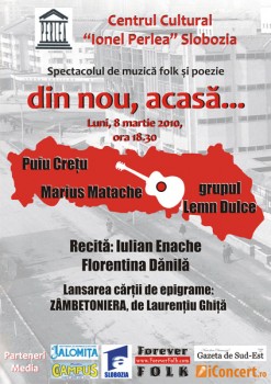 Luni, 8 martie 2010, ora 18:30, la Centrului Cultural „Ionel Perlea” din Slobozia are loc concertul „Din nou acasă„.