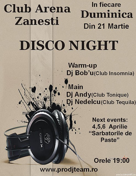 Duminică, 21 şi 28 martie 2010, ora 19:00, în Club Arena din Zanesti este „Disco Night„.