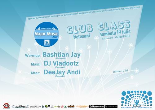 Sambata. 18 iulie 2009 de la ora 22:00 in Club Class din Botosani se vor afla la platane Dj Vladootz, Bashtian Jay, DeeJay Andi.