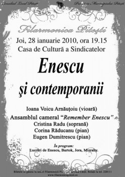 Joi, 28 ianuarie 2010, ora 19″15, la Casa de Cultura a Sindicatelor din Pitesti are loc concertul „Enescu si Contemporanii„.