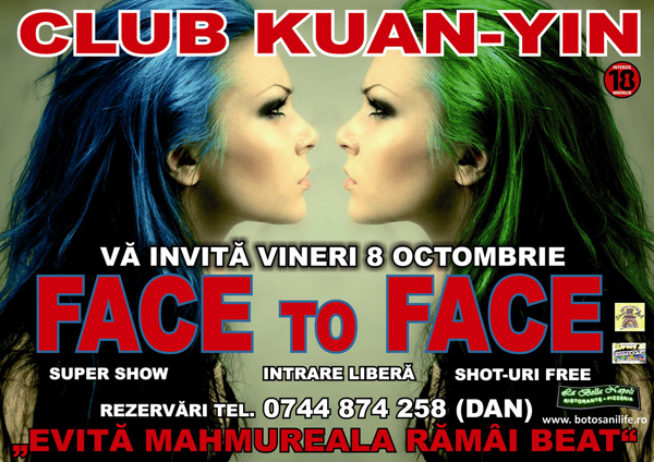 Vineri, 8 octombrie 2010, la Kuan-Yin Club din Botoşani are loc petrecerea „Face to Face„.