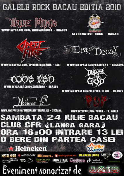 La Galele Rock Bacău ediţia 2010 vor urca pe scenă trupele: True Mind, 8&15, Open Fire, Era Decay, Code Red, Deliver the God, Nocturnal Fall & P.O.V.