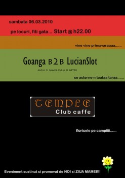 Sâmbătă, 6 martie 2010, ora 22:00, Goanga & Lucian Slot vor mixa back2back în Club Temple din Piteşti.
