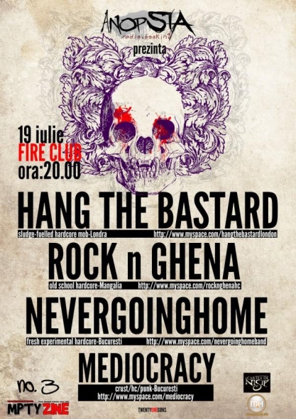 Sâmbătă, 19 iulie 2010, ora 20:00, în Fire Club din Bucureşti vor concerta trupele Hang The Bastard, Rock n Ghena, Mediocracy & Nevergoinghome.