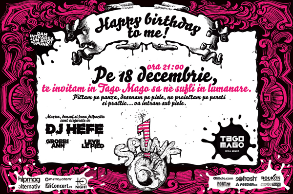 Sâmbătă, 18 decembrie 2010, la Club Tago Mago din Bucureşti are loc petrecerea „Happy Birthday Spunk„.