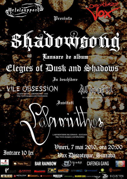 Vineri, 7 mai 2010, ora 20:00, trupa Shadowsong va lansa albumul „Elegies of Dusk and Shadows” la Discotheque Vox din Suceava.