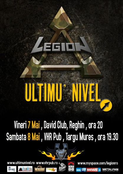 Vineri şi sâmbătă, 7 şi 8 mai 2010, trupele Legion şi Ultimu’ Nivel vor concerta la Club David din Reghin şi VHR Pub din Târgu Mureş.