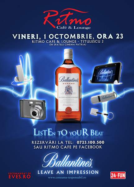 Vineri, 1 octombrie 2010, ora 23:00, la Ritmo Cafe & Lounge din Braşov are loc petrecerea Ballantine’s, „Listen to your beat„.