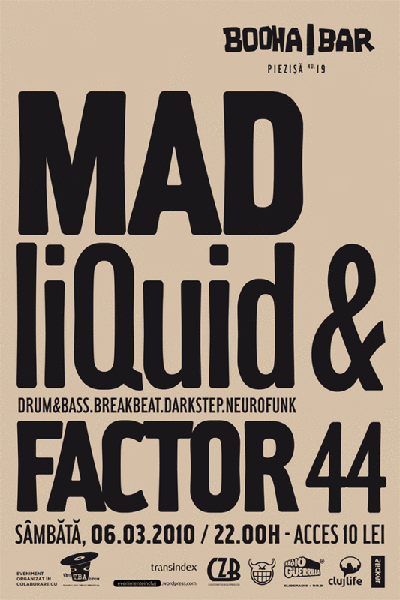 Sâmbătă, 6 martie 2010, ora 22:00, Booha Bar din Cluj-Napoca ne invită la petrecere alături de Madliquid & Factor 44.
