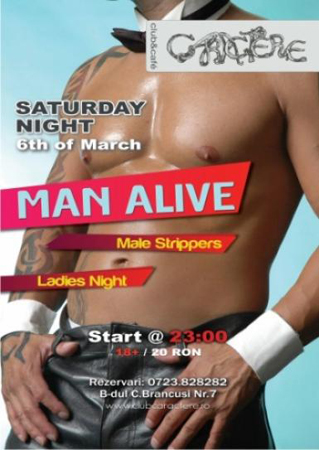 Sâmbătă, 6 martie 2010, ora 23:00, toate doamnele şi domnişoarele sunt invitate în Club Caractere din Târgu Jiu are show-ul celor de la „Man Alive„.