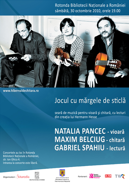 Sâmbătă, 30 octombrie 2010, ora 19:00, Natalia Pancec, Gabriel Spahiu şi Maxim Belciug vor concerta la Biblioteca Naţională din Bucureşti.