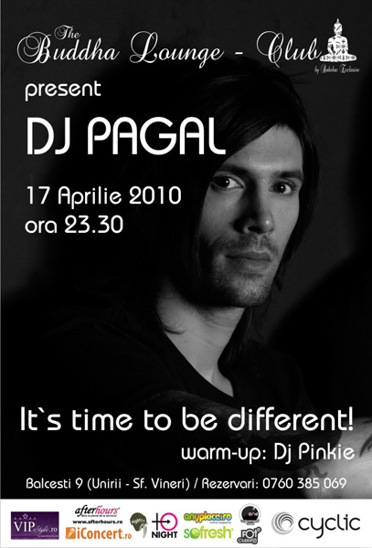 Sâmbătă, 17 aprilie 2010, ora 23:30, Pagal va mixa la The Buddha Lounge din Bucureşti.