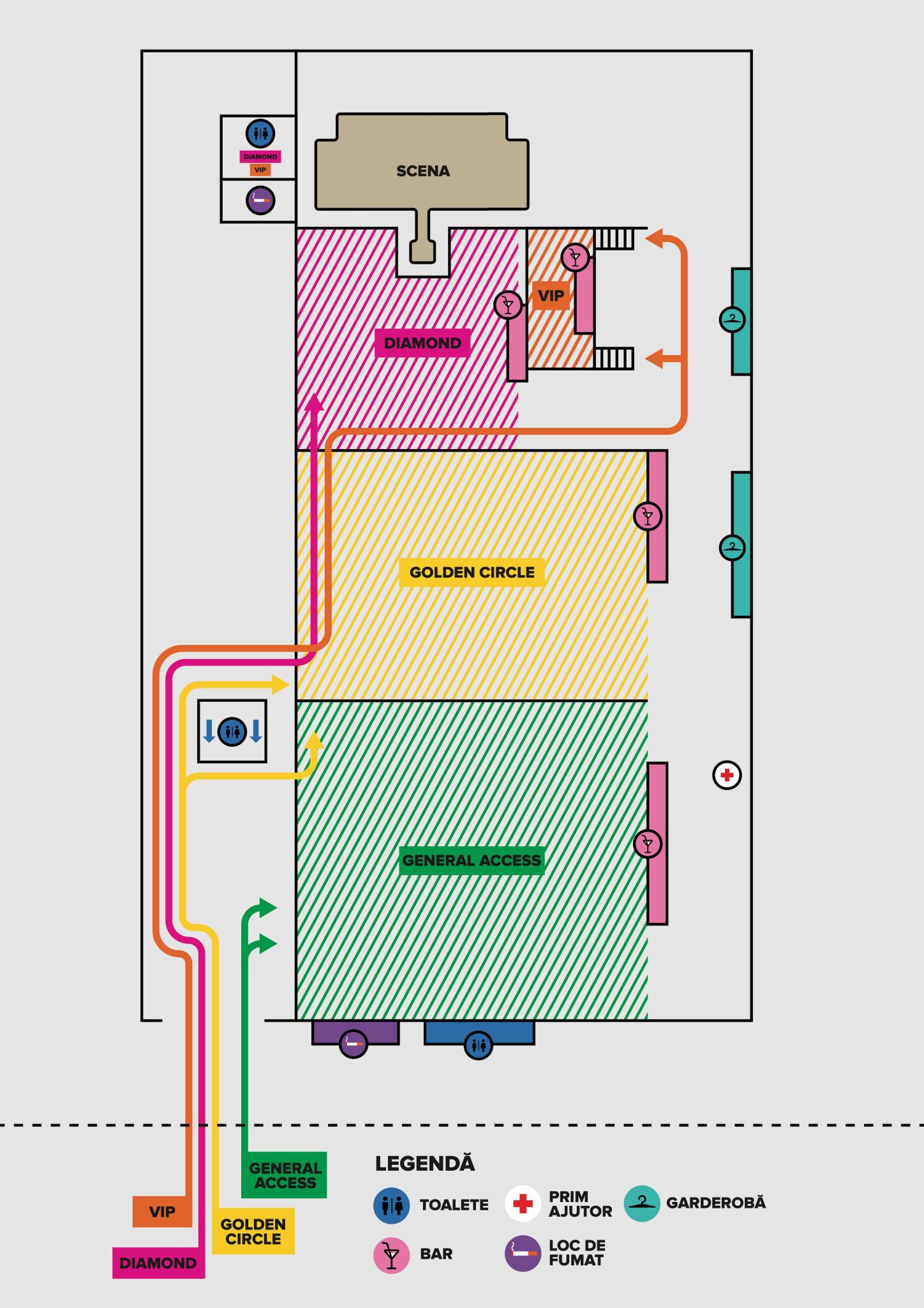 Organizatorii recomandă fanilor să vină din timp pentru a evita aglomerația la porți, dar nu înainte de ora oficială de deschidere, 19:00. Accesul este permis doar pe baza unui bilet valid, achiziționat exclusiv prin platformele oficiale. La intrare, biletul va fi scanat și înlocuit cu o brățară aferentă zonei alocate, fiecare zonă având un acces separat.