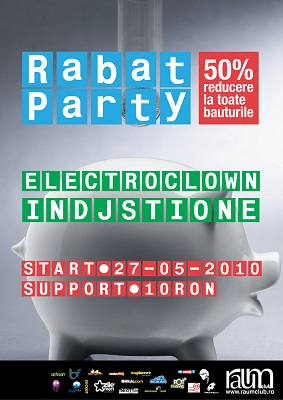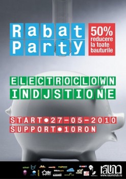Joi, 27 mai 2010, în Club Raum din Cluj-Napoca are loc petrecerea „Rabat Party” cu Electroclown şi Indjstione la platane.