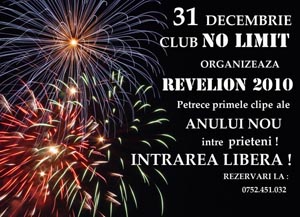 Joi, vineri, sambata si duminica, 31 decembrie 2009 dar si 1, 2 si 3 ianuarie 2010, clubul No Limit din Bacau ne invita la patru seri pline de distractie cu ocazia Revelionului.