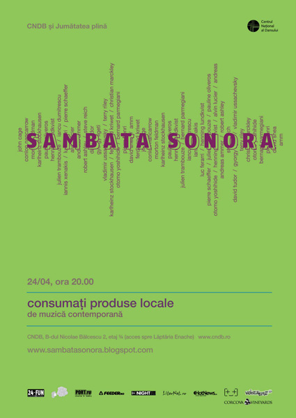 Sâmbătă, 24 aprilie 2010, ora 20:00, la Sala Ronda de la Centrul Naţional al Dansului din Bucureşti are loc Sâmbăta Sonoră.