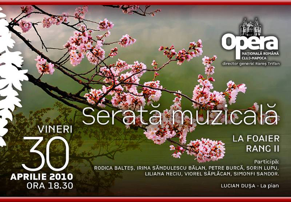 Vineri, 30 aprilie 2010, ora 18:30, la Opera Națională din Cluj are loc o serată muzicală cu arii și duete din creația lirică universală.