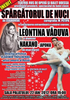 Duminică, 22 ianuarie 2012, ora 19:00, scena Sălii Palatului din Bucureşti va fi învăluită de feeria poveştii „Spărgătorul de nuci”, interpretată de balerinii Teatrului Rus de Operă şi Balet Odessa. Spectacolul, aflat sub direcţia artistului emerit al Rusiei Vladimir Troschenko, o va avea în distribuţie pe soprana Leontina Văduva, alături de renumitul pianist Masakatsu Nakano. „Spărgătorul de nuci” a devenit unul dintre cele mai frumoase spectacole de balet, pentru toate vârstele. Fantezia din basmul lui Hoffman se împleteşte armonios cu frumuseţea compoziţiei lui Ceaikovski şi cu delicateţea coregrafiei lui Marius Petipa. „Spărgătorul de nuci” reprezintă visul Clarei – povestea clasică a unei fetiţe care se visează o prinţesă curajoasă, salvată de forţele Răului de către un prinţ frumos şi a căror aventură se termină într-un ţinut al dulciurilor. Dar mai mult decât magia inocenţei din basm, spectacolul impresionează prin dans şi frumuseţea muzicii lui Ceaikovski.